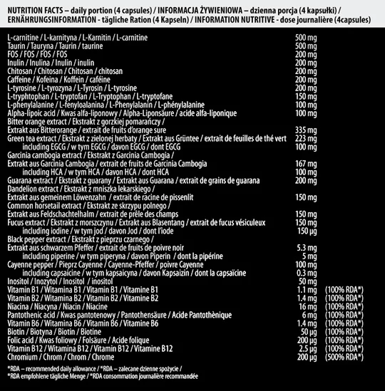 ÖSSZETEVŐK: L-karnitin, taurin, keserű narancssárga gyümölcs kivonat (Citrus aurantium), zöld tealevél kivonat (Camelia sinensis), oligofruktóz, inulin, guarana mag kivonat (Paullinia cupana), pattanásgátló anyag E470b, kitozán, L-tirozin, Garcinia cambogia gyümölcskivonat, vízmentes caffein, L-triptofán, guccukivonat (Fucus vesiculosus), pitypanggyökér kivonat (Taraxacum o? Cinale), közönséges zsurlókivonat (Equisetum arvense), L-fenilalanin, alfa-lipoinsav, Cayenne-paprika , inozit, vitaminok (nikotinsav, kalcium-D-pantotenát, piridoxin-hidroklorid, ribofl-avin, tiamin-mononitrát, folsav, D-biotin, cianokobalamin), savasságszabályozó E330, fekete bors gyümölcskivonat (Pipper nigrum), króm-pikolinát, héj (zselatin, E171 festék). A termék nyomokban tartalmazhat szóját, búzát és diót.