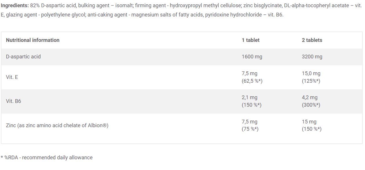Ingredients: 82% D-aspartic acid, bulking agent – isomalt; firming agent - hydroxypropyl methyl cellulose; zinc bisglycinate, DL-alpha-tocopheryl acetate – vit. E, glazing agent - polyethylene glycol; anti-caking agent - magnesium salts of fatty acids, pyridoxine hydrochloride – vit. B6.