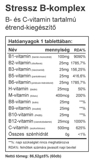 A B-vitamin komplexnek köztudomásúan stressz-csökentő hatása van. A nem túl nagy adagokban rendszeresen bevitt B-vitaminok jól oldják az idegi feszültséget. Számos B-vitamin játszik katalizáló szerepet az ingerületátvivő anyagok és az idegsejtek felépítésében.