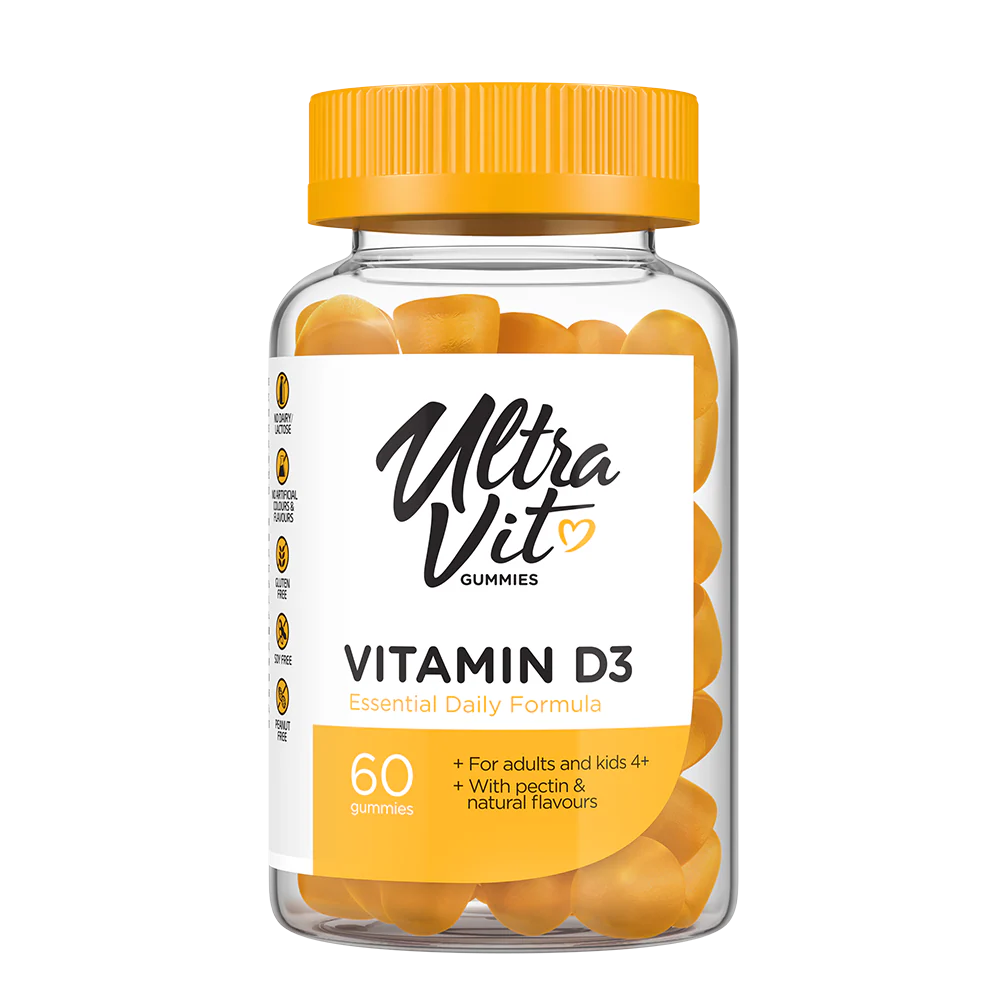 Az UltraVit GUMMIES VITAMIN D3 egy ízletes, esszenciális napi formula a csontok, fogak, izmok és immunrendszer egészségének támogatására. Ezek a finom őszibarack ízű gumicukrok felnőttek és 4 éves vagy annál idősebb gyermekek számára alkalmasak, így családbarát kiegészítők. Minden üveg 60 gumicukrot tartalmaz, pektinnel és természetes aromákkal, vegetáriánus és halal étrendi igényeknek megfelelően.